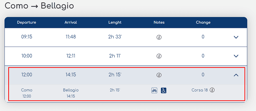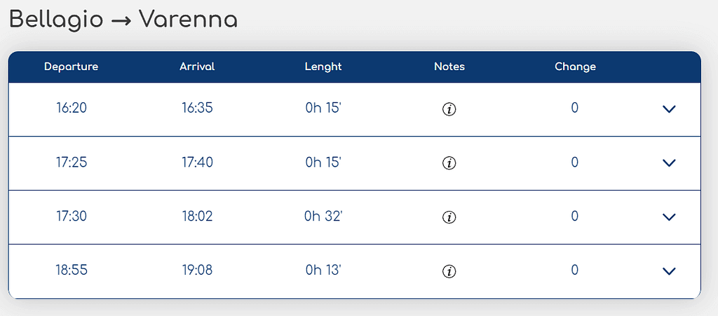 Depending on how long you want to spend in Bellagio, there are different alternatives for which boat to get. The tickets to this boat can also be booked on Navigazionelaghi.it or you can buy them at the ticket office in Bellagio if you want a bit more flexibility in when to leave for Varenna. Here is a screenshot of the schedule for 2024: