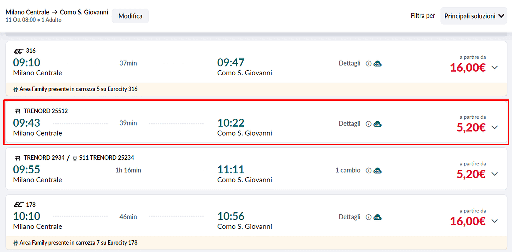 Go to Trenitalias website and look for trains from Milano Centrale and Como S. Giovanni. I would suggest to get an early start, so choose the train at 9:43 that will arrive in Como at 10:22. If you want more time in Como and you can choose an earlier train. That might give you time to see everything on the Top 10: Must-See locations in the Old Town of Como.
